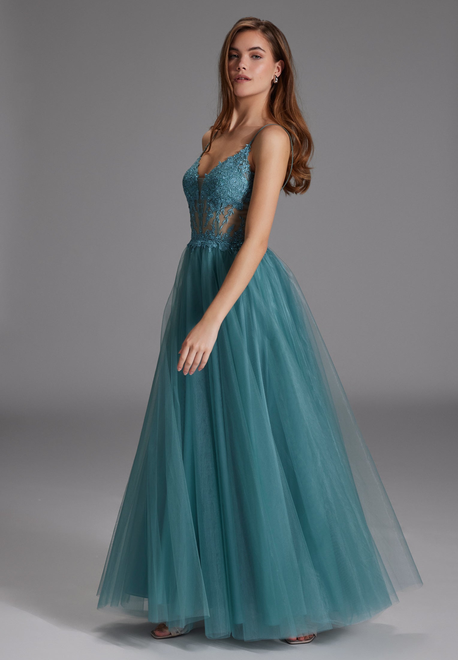 This dreamy ball gown combines a touch of romance with modern design. The delicate, embroidered bodice flows into a voluminous tulle skirt that sways gently with every step. Perfect for a fairytale wedding, a formal ball, or a glamorous evening where you want to feel like a princess. This dress is guaranteed to create unforgettable moments. Fit & Measurements: Our model is 177 cm tall and wears size 36. We recommend choosing one size larger.