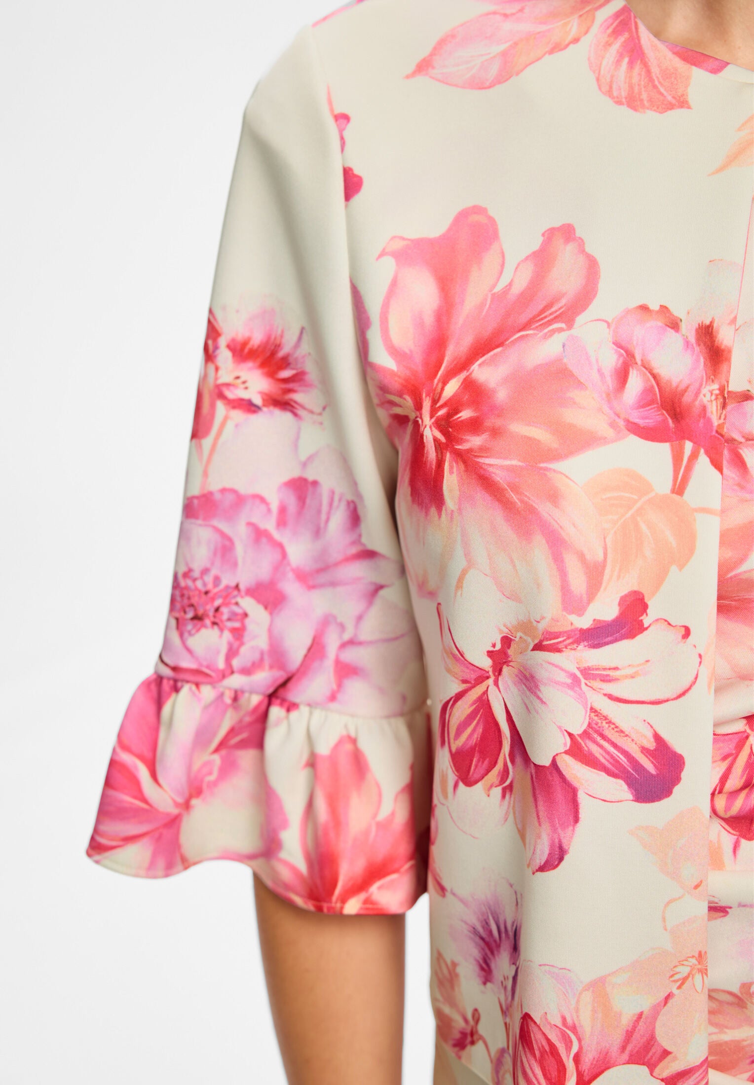 Kastige Jacke aus bedrucktem Scuba mit Rüsche am Ärmelsaum